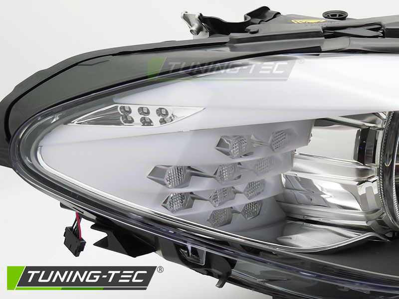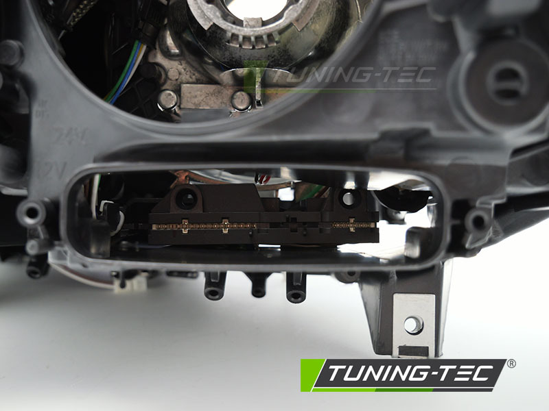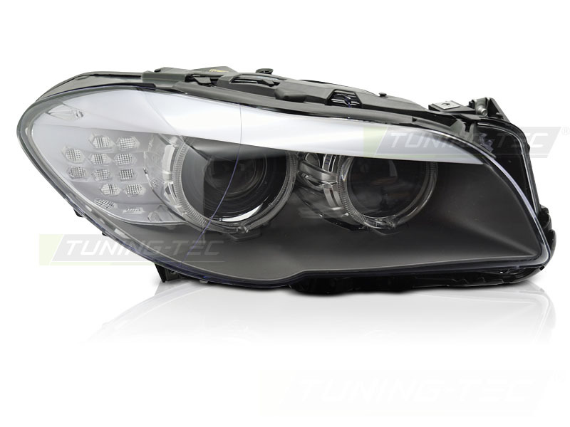 The high-quality xenon headlight on the right side fits BMW F10 F11 models from 2010 to 2013 and offers a perfect replacement solution for original headlights without AFS functionality. Featuring modern LED daytime running lights, parking lights, and turn signal lamps, it provides a sharp, modern look and maximum road visibility. The headlight is E-marked (E4) and approved for street use, ensuring reliability and compliance with standards. It allows electrical adjustment and uses D1S bulbs (not included). The ECU, control unit, and turn signal module must be transferred from the existing headlights.
